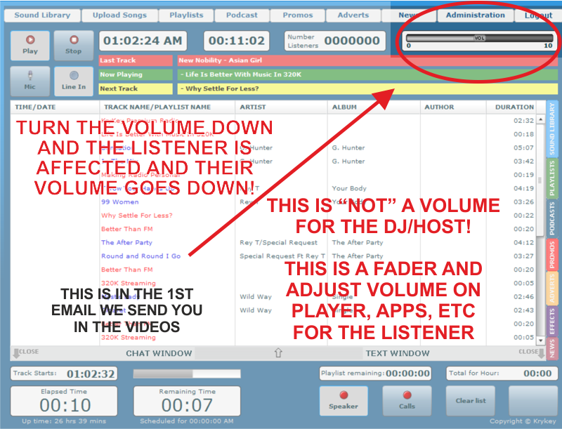 listeners will be affected unless your using the microphone in the Studio Again: it is NOT a volume for the DJ/Host, it is for the music stream going out to YOUR listeners. No Sound