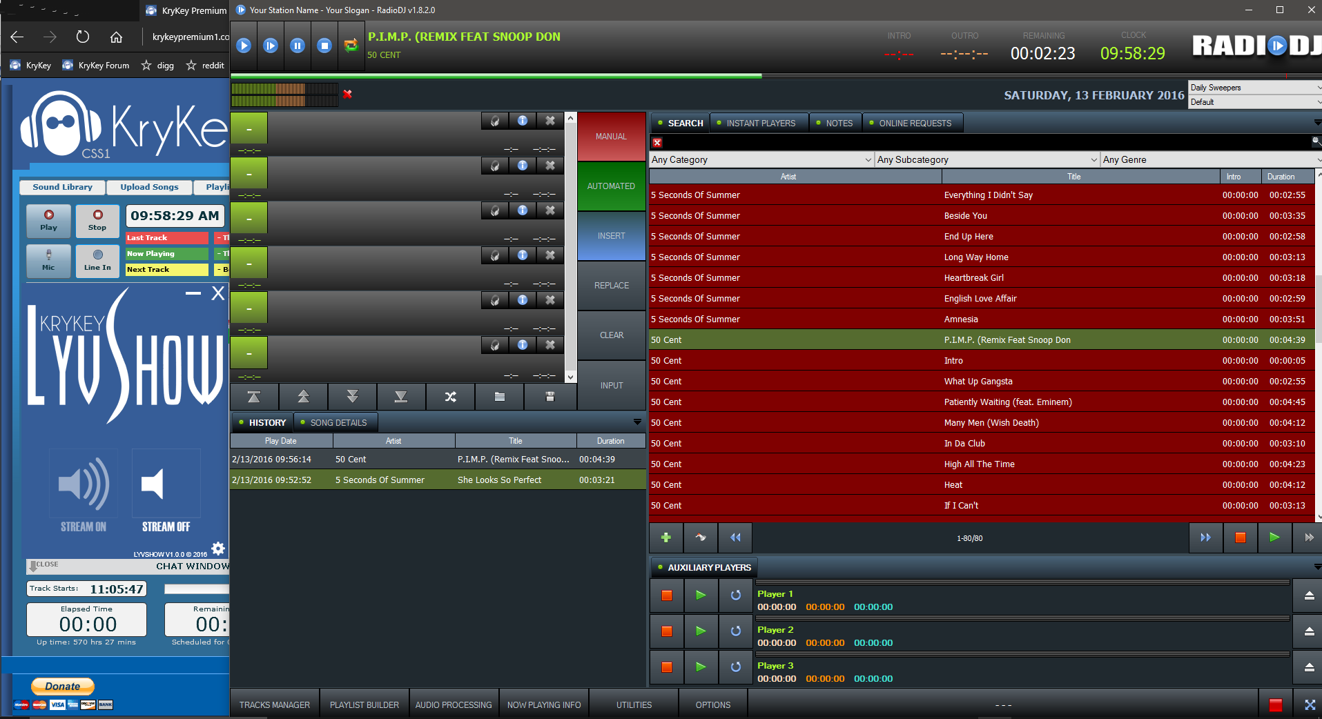 USE YOUR OWN STUDIO (with LyvShow) You can now use your own Studio with your KryKey Premium Radio Station. You will need our LyvShow Studio App (Windows PC only) to use any 3rd party Studio. Open your KryKey Studio Click the SPEAKER button OFF Open LyvShow Click STREAM-ON Open the DJ Software you want to use and start streaming / broadcasting What you hear on your PC is what is being streamed to our servers and out to your premium radio station's site, players and on the mobile apps & Tunein apps See video HERE using RadioDJ and LyvShow Below are some other DJ software available ![]() KryKey Studio, LyvShow, RadioDJ ![]() KryKey Studio, LyvShow, VirtualDJ ![]() DJ PROMIXER ![]() MIXXX |