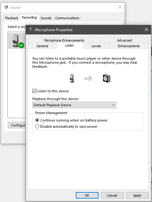 Broadcaster, etc., then the microphone will be heard when you also use Skype, but if you are just using a media player, then you need to turn your microphone (sound) on so it can be heard, and this is how: SETTING YOUR MICROPHONE For using Skype and other communication programs with your use your microphone, you need to change the settings in Windows so your microphone is heard, and you can do this by following the steps below (not required if your using RadioDJ etc., as microphone is heard) ![]() Right-click on speaker icon (above) and select Recording Devices (below) ![]() Select Properties (below) ![]() Go to the Listen Tab and Check the 'listen to this device' box (below) and then click OK and then close Sound panel. ![]() WHEN TALKING LIVE WITH A CALLER, MAKE SURE THEY HAVE THEIR RADIO OFF, REMEMBER TO WEAR HEADPHONES AND NOT LISTEN TO THE LIVE STREAM AS IT WILL BE DELAYED JUST LIKE REAL RADIO "IF YOU CAN HEAR IT, YOU CAN STREAM IT" |